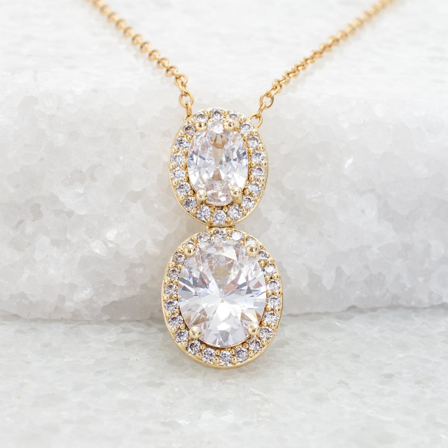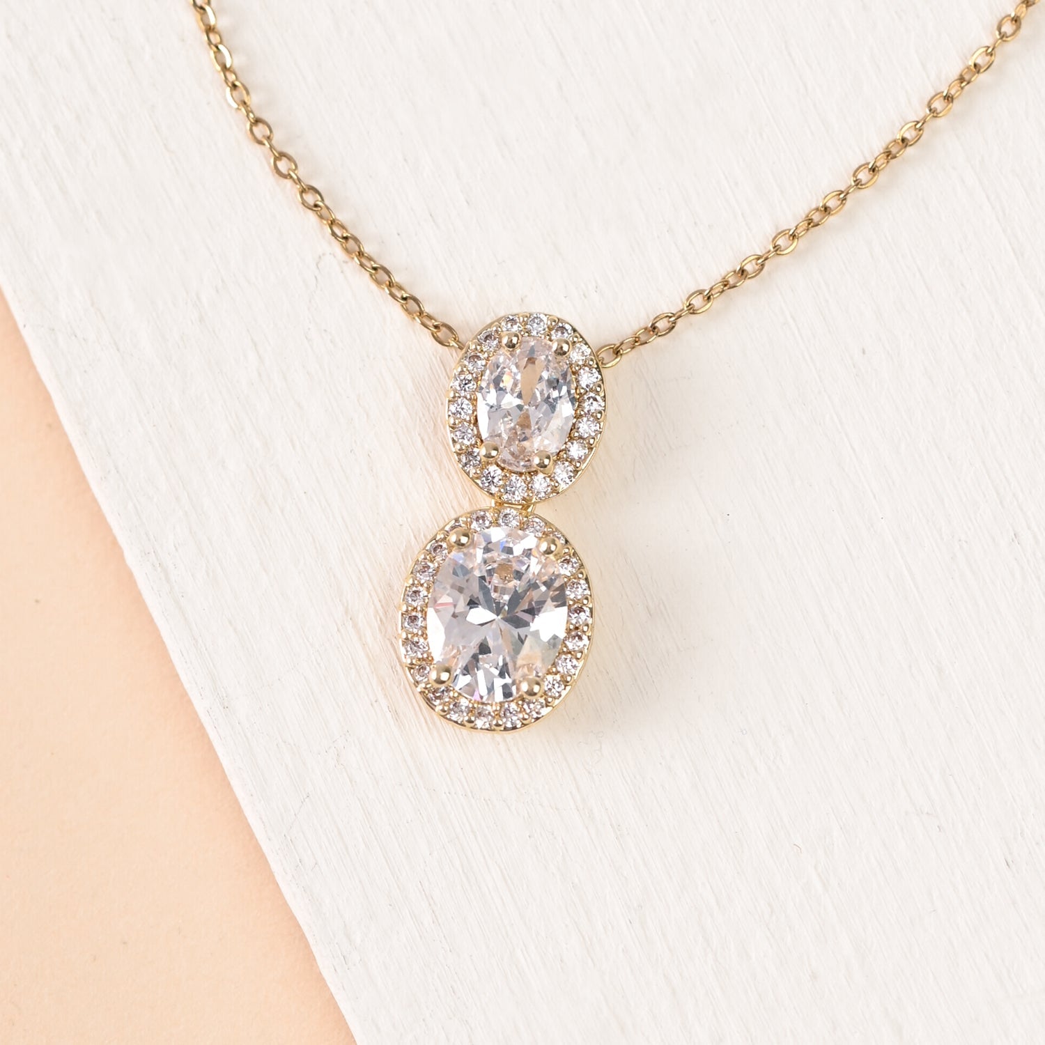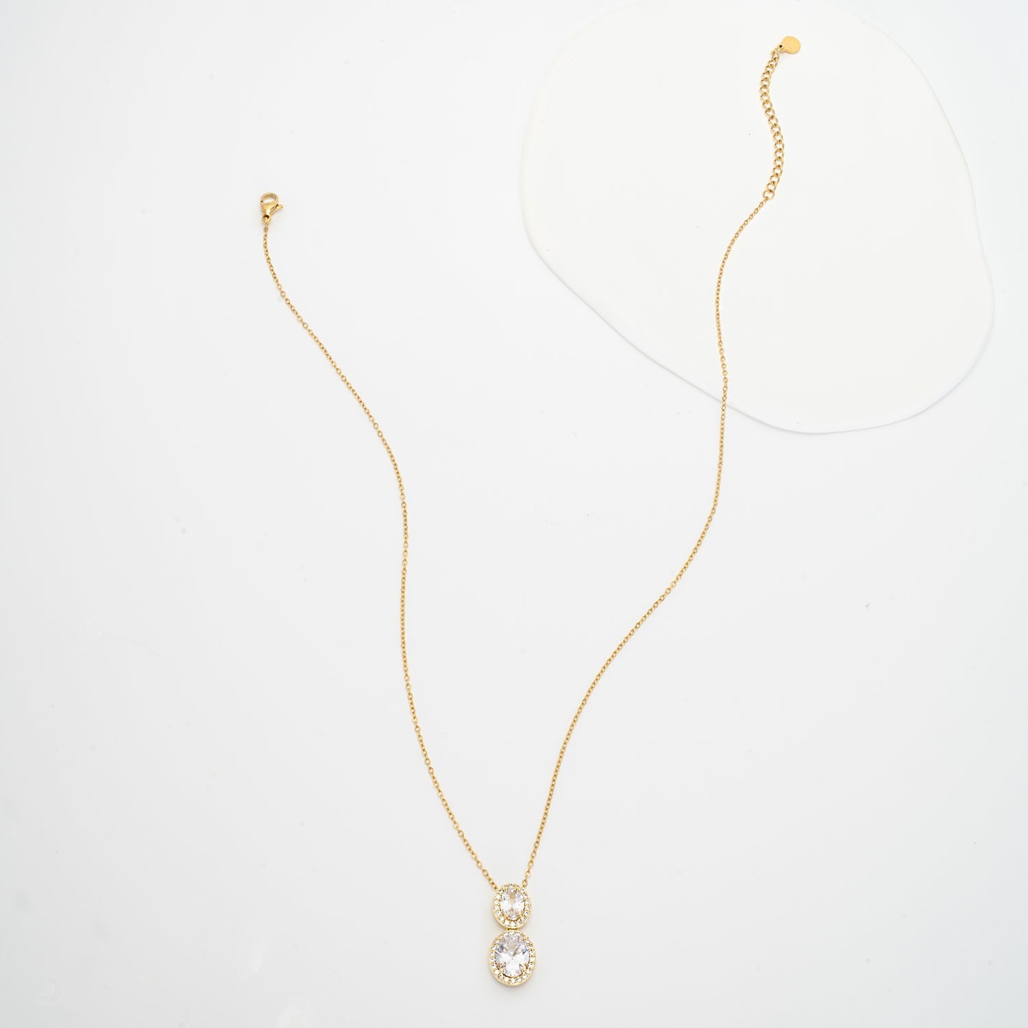 The Divine Connection Gold and Zircon Necklace is a truly captivating and exquisite piece that embodies the essence of everlasting connections. The timeless Divine Connection Necklace features two perfectly-paired shimmering zircon gemstones set in a gleaming zircon and gold setting, creating a harmonious union of sophistication and brilliance. It gracefully drapes along the neckline on an adjustable chain, enhancing your natural beauty with a touch of celestial radiance. The Divine Connection Gold and Zircon Necklace adds an exquisite touch to any ensemble, elevating bridal gowns and formal attire with an air of regal charm.
