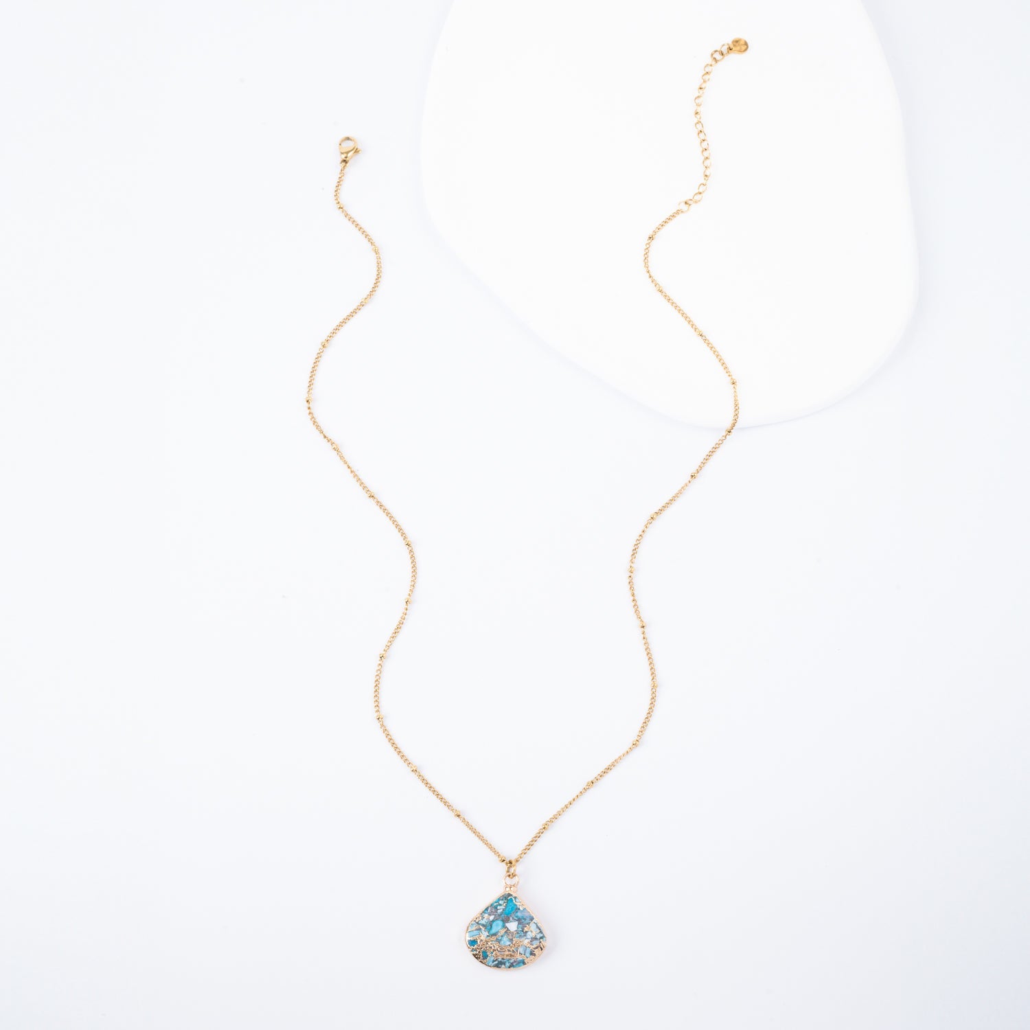 Discover our Turquoise Blossom Pendant, a 14K gold-plated adjustable necklace that captures the ocean's grace. Symbolizing resilience and transformation, its petal-shaped turquoise pendant radiates beauty as it blooms with flecks of gold from within. With your purchase, you support freedom and life transformation as you stand with the survivors of Starfish Project to see every woman valued.