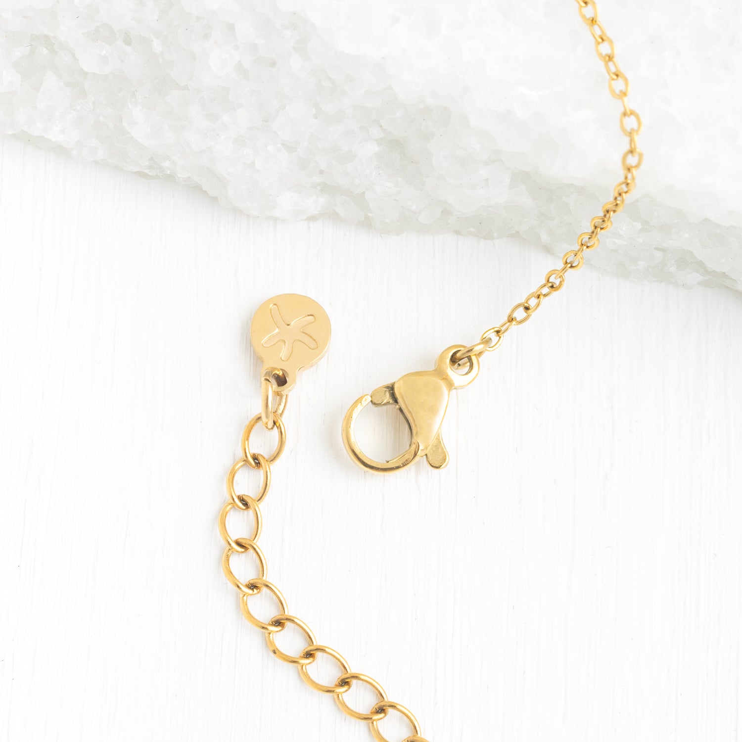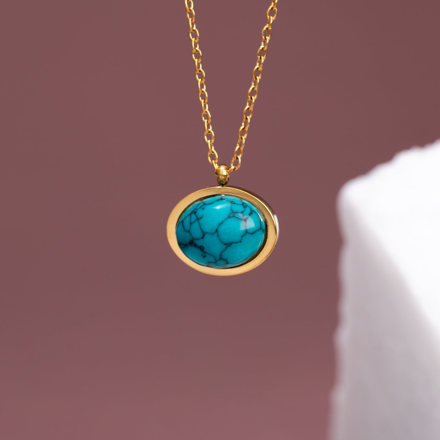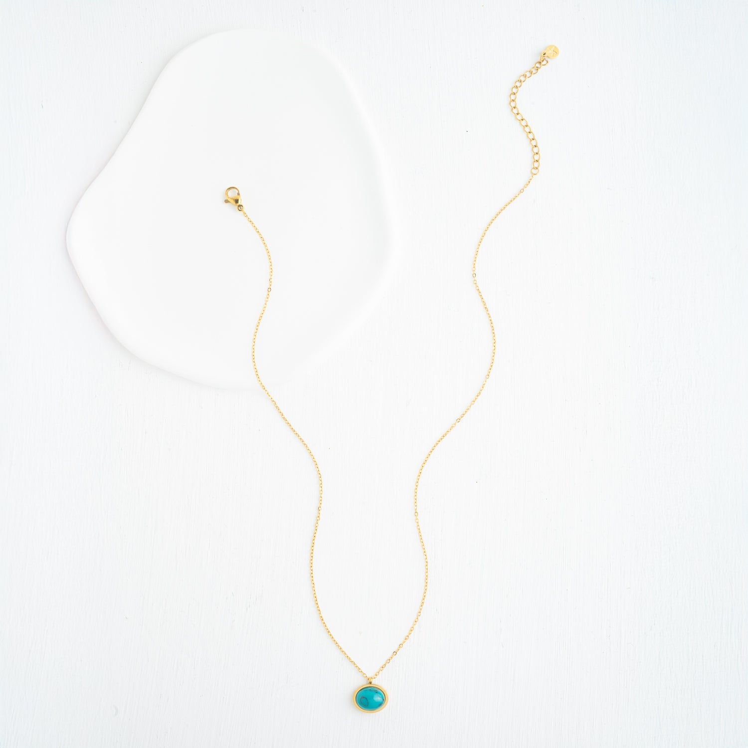 The Hopeful Glow Necklace captures the calming and uplifting energy of turquoise. Featuring a beautiful oval-shaped bezel set stone, this 14K gold plated necklace radiates tranquility and balance. The adjustable chain ensures a perfect fit for comfort and versatility, allowing you to wear it with any outfit.
