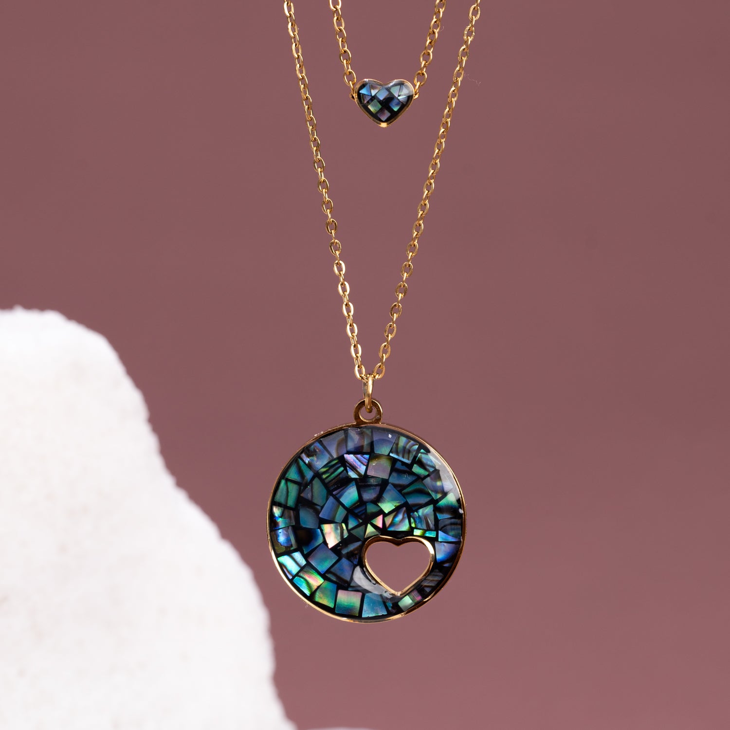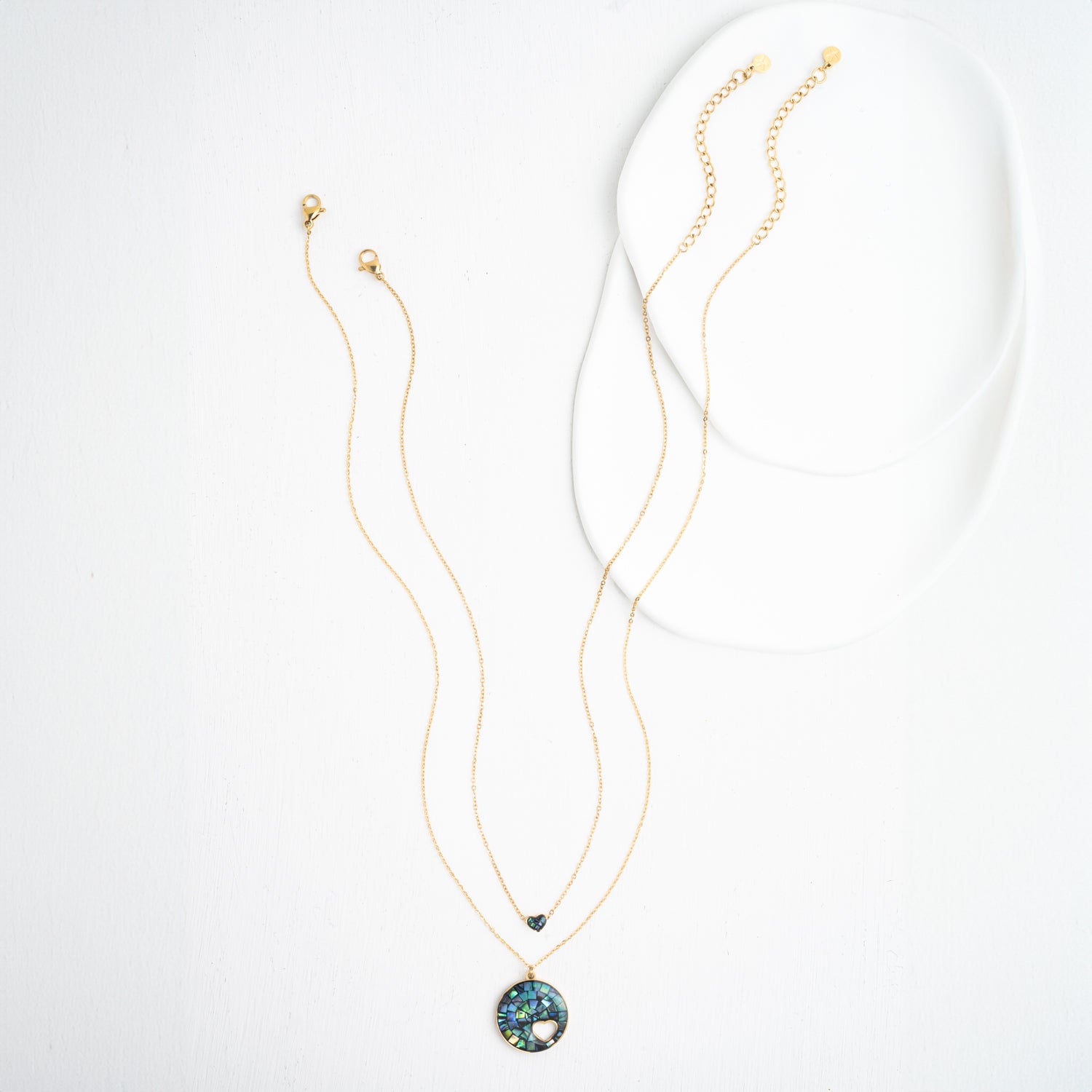 The Journey Together Necklace Set in abalone is a beautiful expression of unity, transformation, and empowerment. The first necklace features a larger circle pendant, adorned with a rich mosaic of blue and green abalone, with a tiny heart cutout at the center—symbolizing love and connection. The second necklace features a smaller charm, also reversible, with one side showcasing a tiny heart-shaped piece of abalone, while the other side shines in radiant gold. Both necklaces are adjustable, offering versatile styling options for any occasion. This set represents the powerful journey of growth and the strength of the community that supports each other. Every purchase helps women on their path to freedom and new beginnings. Wear and gift this set as a reminder that we are stronger together.