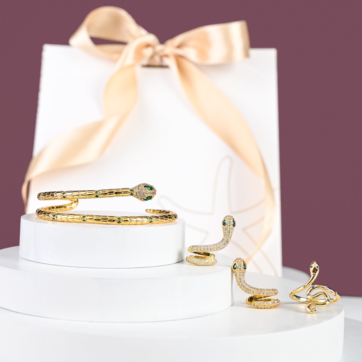 In many parts of Asia, snakes are affectionately called 'little dragons' because they share qualities of elegance, wisdom, and transformation. While dragons represent majestic power and protection, snakes are seen as their grounded, graceful relatives—symbols of resilience and renewal. Celebrate the women in your life who embody strength and grace with this perfectly paired shimmering zircon and 14K gold plated gift set! She is sure to love this celebration of new beginnings and the life-transforming impact of your gift– Each helps transform the life of a woman experiencing freedom and building a dignified career at Starfish Project.