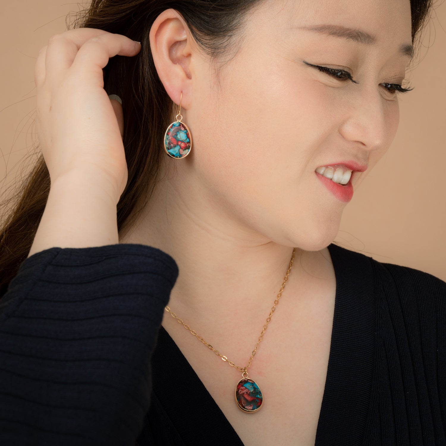 Our Mosaic Jasper Earrings feature a beautiful medley of dazzling colors. Rich hues of blue and crimson flow together around accents of bronze marbling within the jasper stone framed in 14K plated gold. Wear this surprisingly lightweight stone day to night to complete any look. As your Mosaic Earrings draw attention, take every opportunity to share the life-transforming impact of your jewelry!